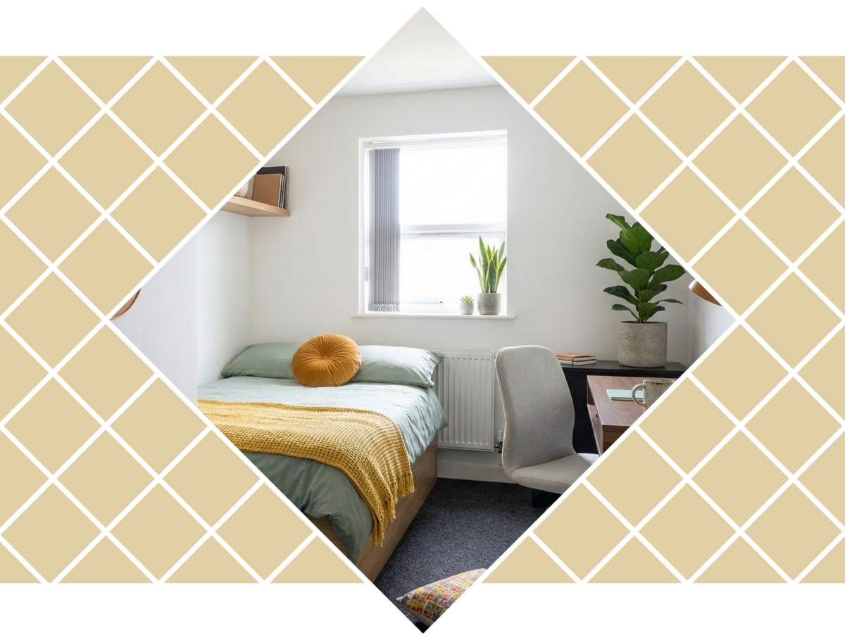 - Möbliertes Zimmer mit Bett, Schreibtisch, Schrank etc.